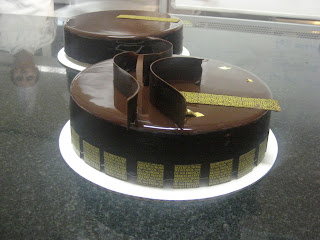 Now for the decoration on the chocolate hazelnut cake- a chocolate mirror glaze coats the whole cake and we topped the cake with chocolate decorations made by chef Dimitri, which we will be learning in chocolate class very soon.